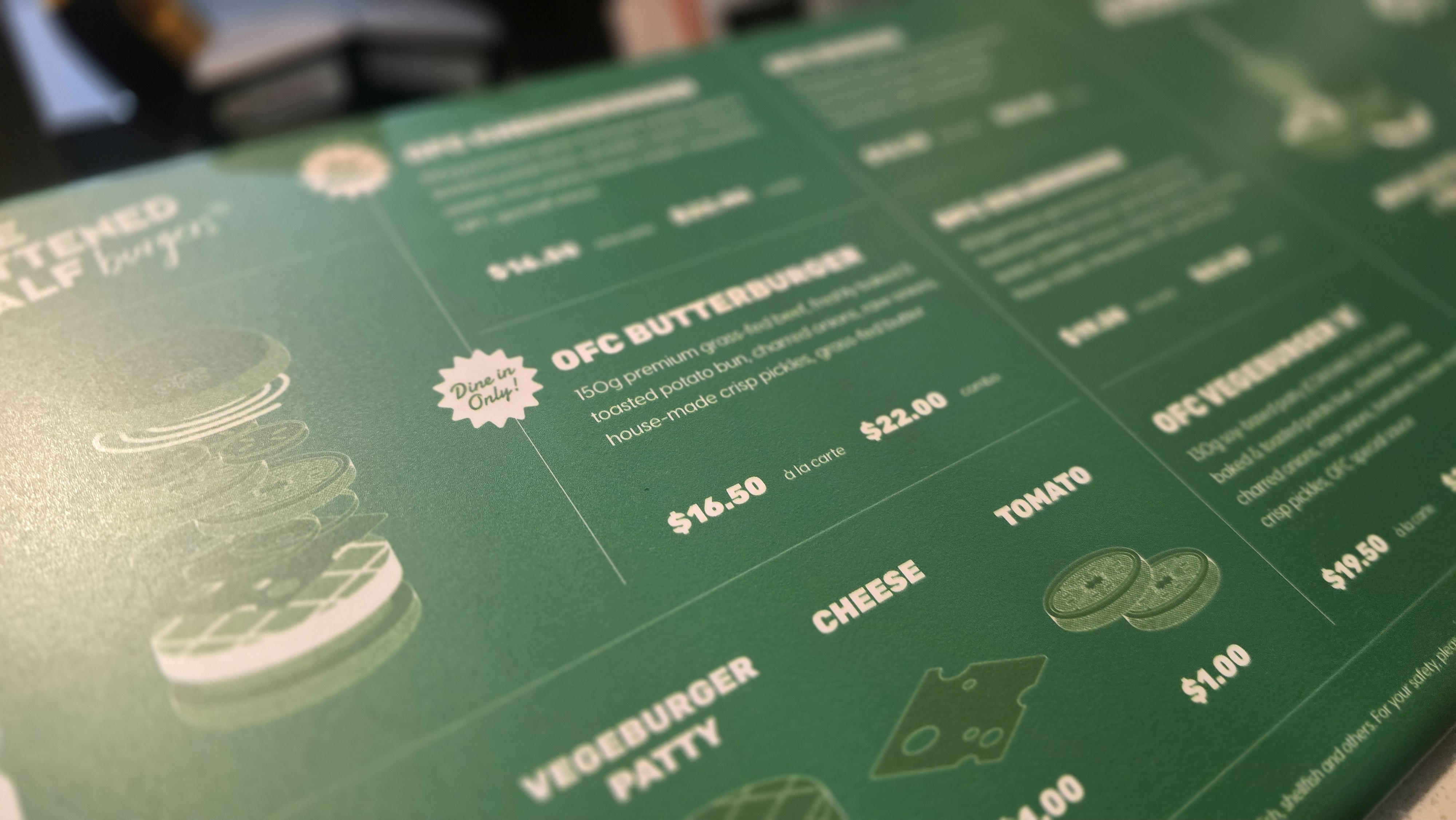 무엇보다 **OFC 버터버거(SGD 16.50)**의 진짜 주인공은 치즈 대신 들어가는 두툼한 목초 사육 버터 두 조각이다. 뜨거운 패티 위에서 천천히 녹아내리며 버거 전체를 감싸는 크리미한 풍미 — 진하고 풍요롭고, 한 번 맛보면 다른 버거로 돌아가기 어렵다. 버터가 금세 녹아드는 특성상 포장 판매는 하지 않으니, 자리에 앉아 바로 먹는 것이 정석이다.