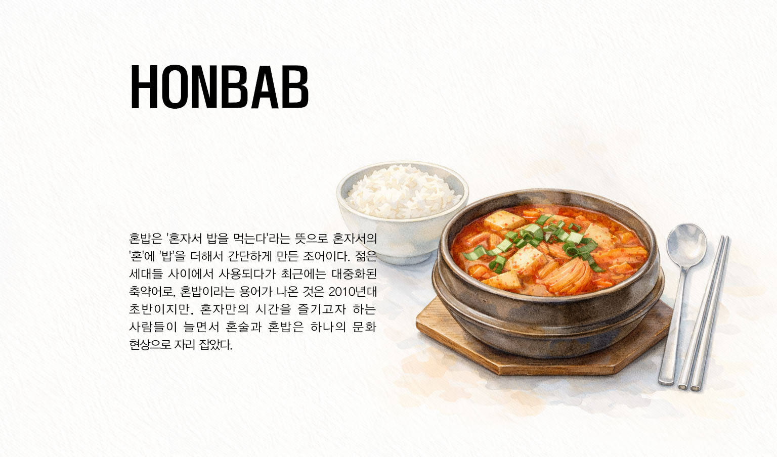 도시의 식구는 혼밥과 혼술의 형태로 개인화되고 있다. '함께 먹는 공동체'의 의미는 점차 희미해지고, 각자의 시간과 공간에서 식사를 해결하는 모습이 일상이 되었다. 그러나 이러한 변화 속에서도 밥을 중심으로 한 한국인의 식문화 구조 자체는 여전히 유지되고 있다. 1인 가구의 식탁에도 밥과 국, 반찬이라는 기본 틀이 남아있는 것이다.
