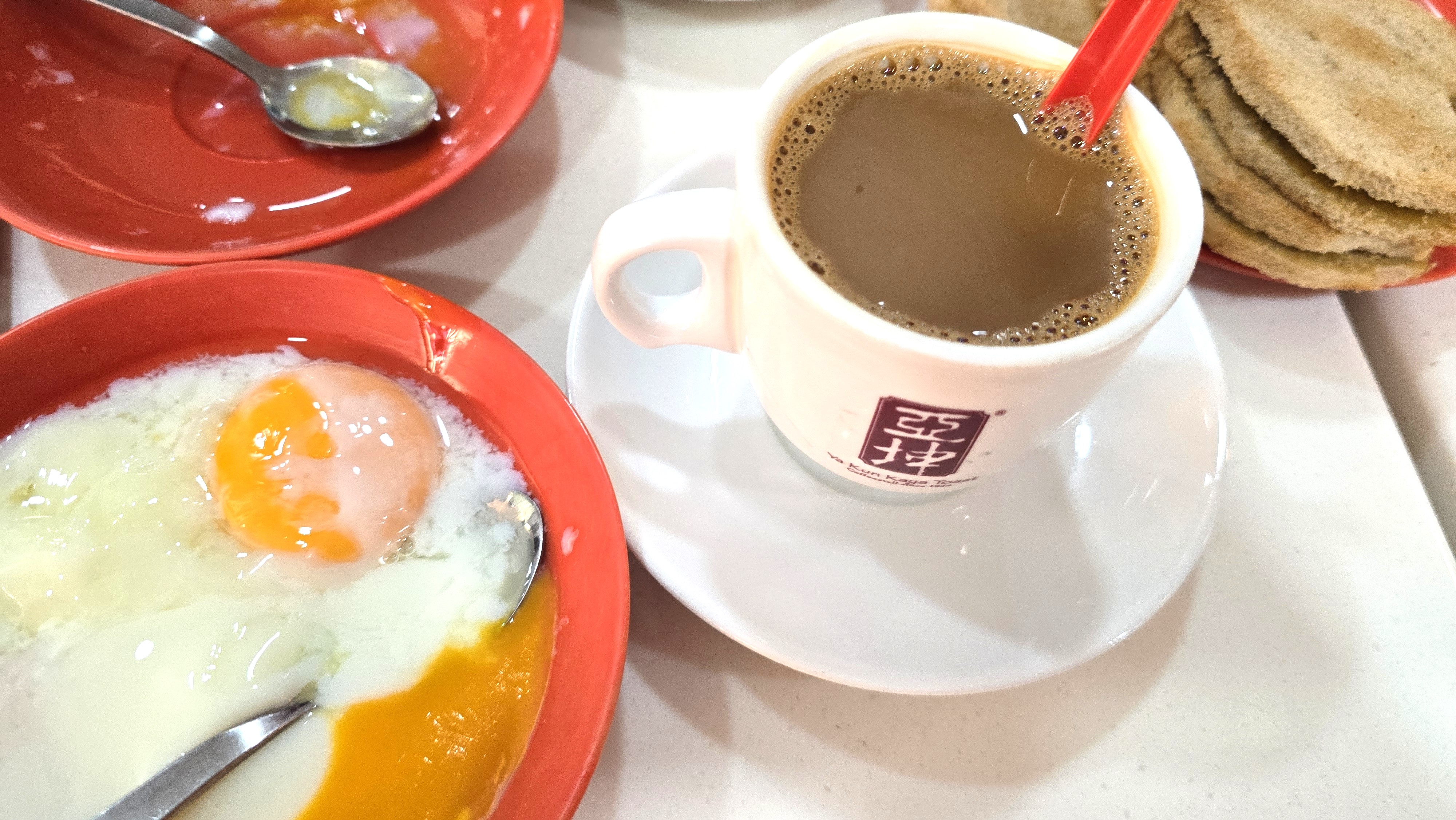 야쿤의 수란은 처음 보는 사람에게 당황스러울 수 있다. 달걀을 깨면 흰자는 반투명하고 노른자는 아직 따뜻하게 흘러내리는 상태 — 바로 싱가포르식 반숙이다.