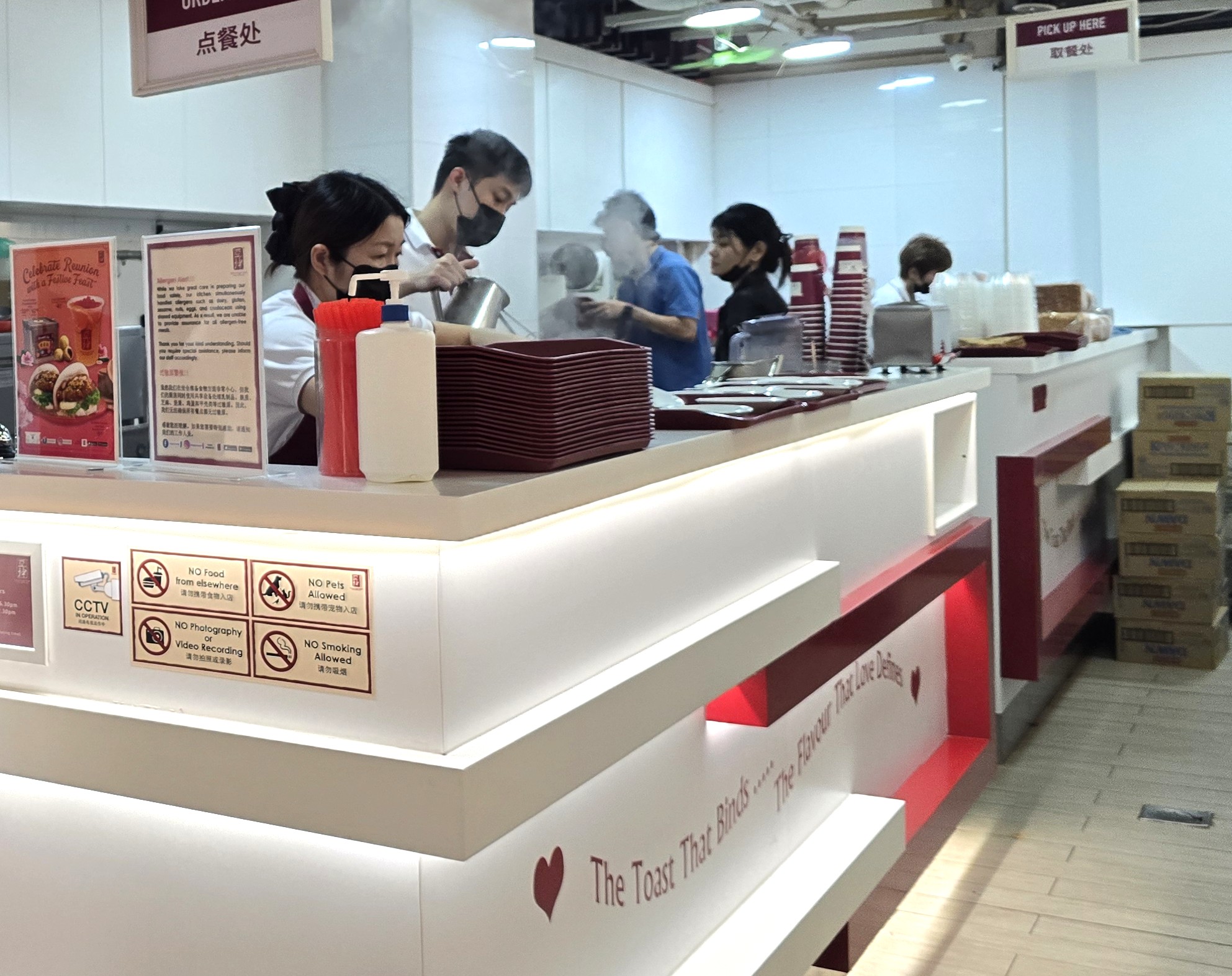 래플스시티 매장은 관광객과 직장인으로 늘 붐빈다. 테이블이 좁고 회전이 빠른 편이라 여유롭게 앉아 즐기기보다는 빠르게 먹고 나오는 분위기다. 이른 아침이나 오후 2~3시 사이가 비교적 한산하다.